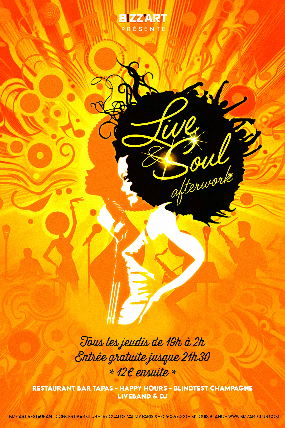 Monsieur 100 000 volts pour vous sur scène ce soir, ça va encore déménager de Marvin Gaye à Prince et Nirvana!!!! On gagne aussi des coupes de Champagne avec notre irrésistible MC chanteuse Marina et on danse sur la playlist del maestro DJ JP Mano jusque tard dans la nuit…